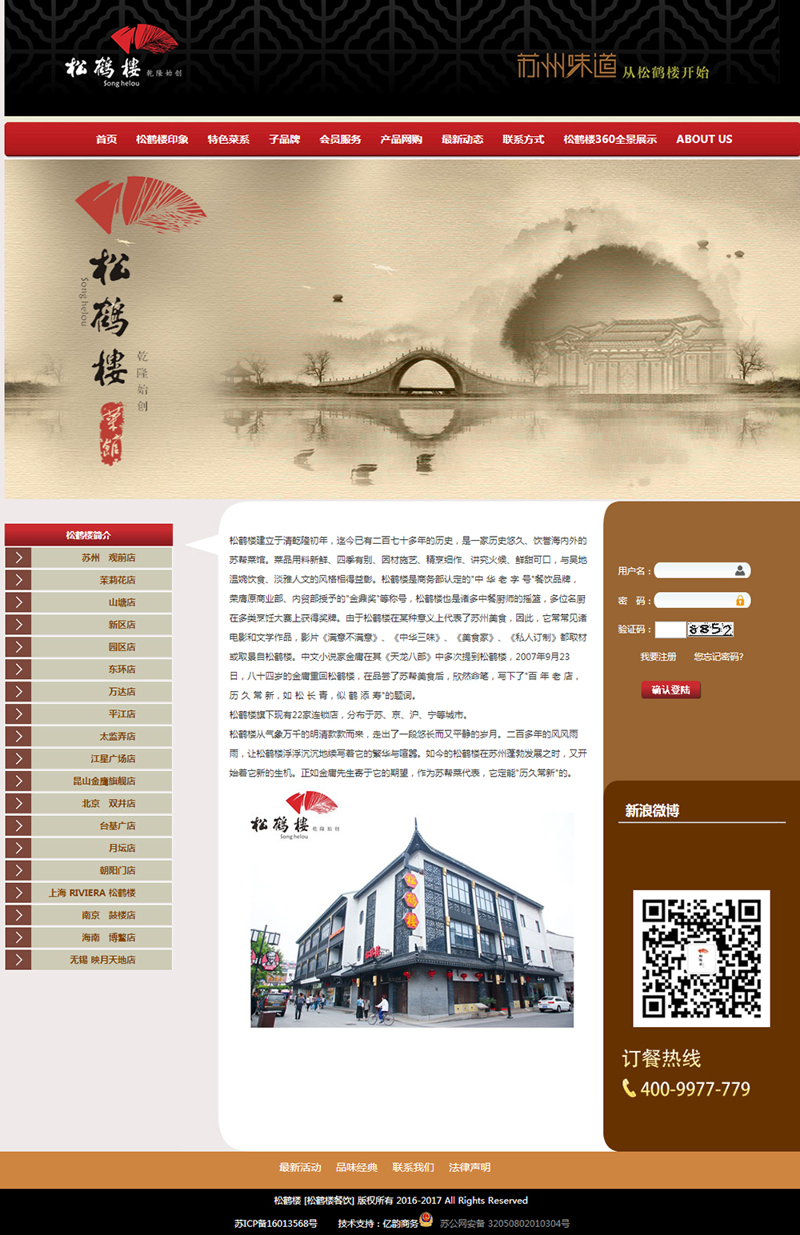 松鶴樓始創(chuàng)于清乾隆初年,迄今已有二百七十多年的歷史,是目前蘇州地區(qū)歷史最悠久、飲譽海內(nèi)外的正宗蘇幫菜館。菜品用料上乘、四季有別、因材施藝、精烹細(xì)作、講究火候、鮮甜可口,與吳地溫婉靈秀、精致淡雅的風(fēng)格相得益彰。松鶴樓是商務(wù)部首批認(rèn)定的"中華老字號"餐飲品牌,榮膺原商業(yè)部、內(nèi)貿(mào)部授予的"金鼎獎"、"國家特級菜館"等稱號,松鶴樓商標(biāo)獲國家工商總局商標(biāo)局頒布的馳名商標(biāo)。松鶴樓也是中國優(yōu)秀廚師的搖籃,多位名廚在國內(nèi)外烹飪大賽上屢獲金獎。由于松鶴樓在某種意義上代表了蘇州美食,因此,它常常見諸電影和文學(xué)作品,影片《滿意不滿意》、《中華三味》、《美食家》、《私人訂制》都取材或取景自松鶴樓。著名小說家金庸在其《天龍八部》中多次提到松鶴樓,2007年9月23日,八十四歲的金庸重回松鶴樓,在品嘗了蘇幫美食后,欣然命筆,寫下了"百年老店,歷久常新,如松長青,似鶴添壽"的題詞。
