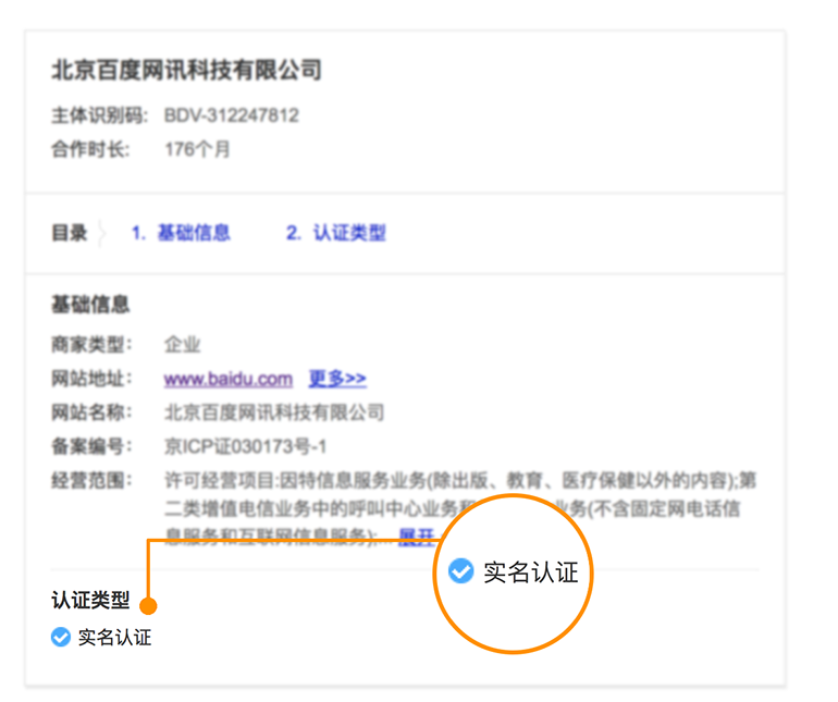 實(shí)名實(shí)網(wǎng)認(rèn)證是對(duì)網(wǎng)站經(jīng)營(yíng)主體的身份真實(shí)性進(jìn)行核實(shí),并結(jié)合營(yíng)業(yè)執(zhí)照、法人身份證、組織機(jī)構(gòu)代證、ICP備案、銀行對(duì)公賬戶等多種手段,確保網(wǎng)站經(jīng)營(yíng)及管理主體的身份合法存在,核驗(yàn)通過(guò)的信息會(huì)進(jìn)行公開(kāi)展示,以便于在消費(fèi)者決策時(shí),提供信息參考。